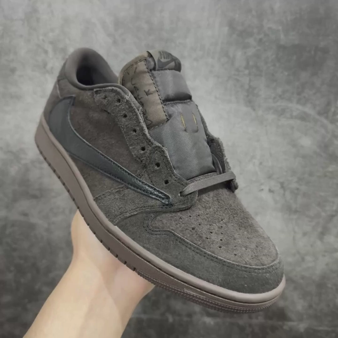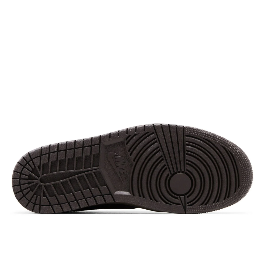 O Travis Scott x Air Jordan 1 Retro Low OG SP 'Velvet Brown' exibe o Swoosh invertido característico de Scott no cabedal de couro preto amassado e camurça marrom. Uma etiqueta Nike Air trançada fica sobre a língua de náilon marrom, enquanto as marcas Cactus Jack e Jordan Wings descombinadas adornam a aba traseira de cada tênis. Ancorando o tênis está um cupsole de borracha marrom com construção de parede lateral costurada e uma unidade Air-sole encapsulada no calcanhar.
