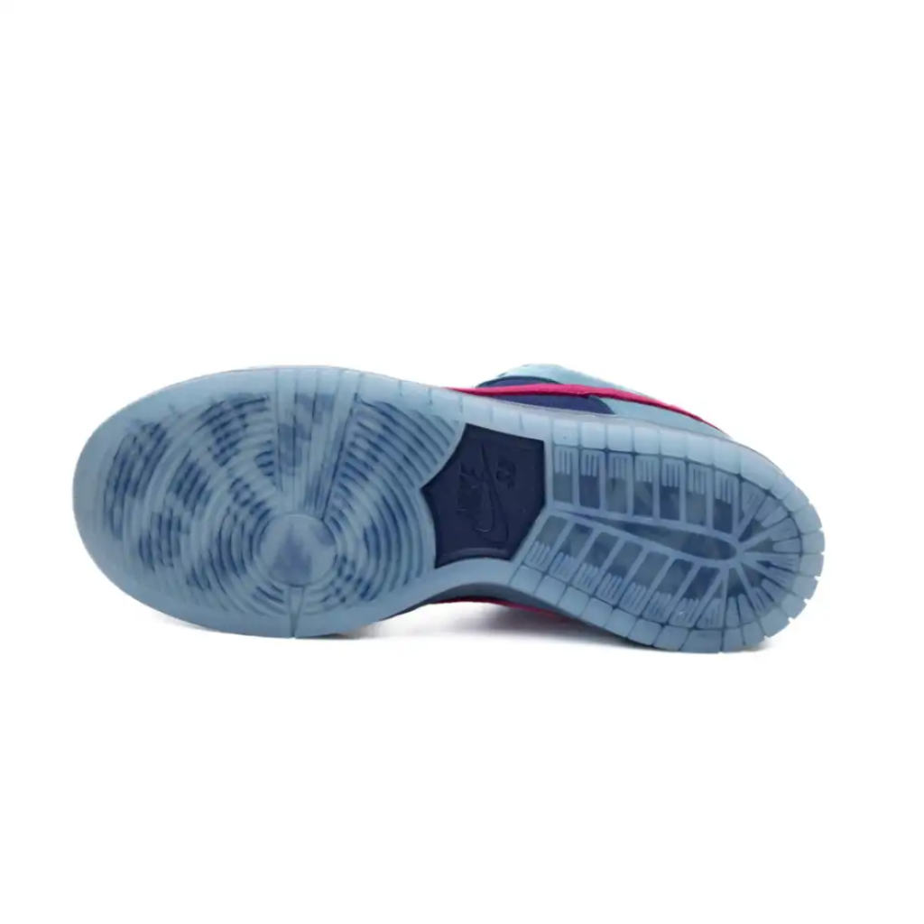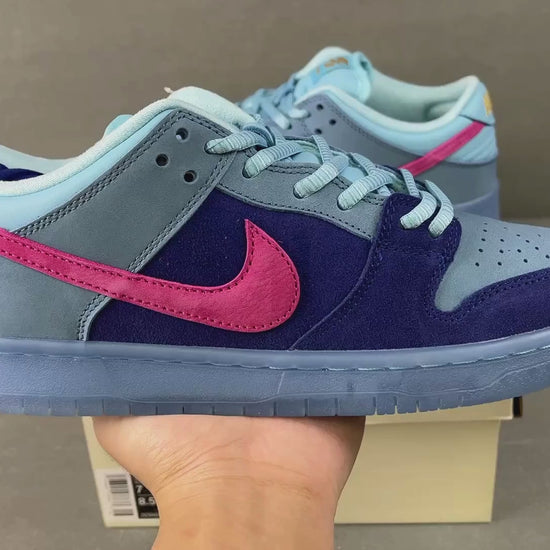 The Run The Jewels x Nike Dunk Low SB '4/20' apresenta uma colaboração de tênis centrada na dupla de hip-hop composta por Killer Mike e El-P. O cano baixo ostenta um cabedal de camurça em vários tons de azul, contrastando com um Swoosh de nobuck texturizado em rosa choque. Bordado na aba traseira, uma marca da Nike em ouro metálico combina com o tecido Nike SB que decora a língua recheada. O tênis é montado em uma cupsole de borracha semitranslúcida, com uma impressão 'Run The Jewels' sob os pés.