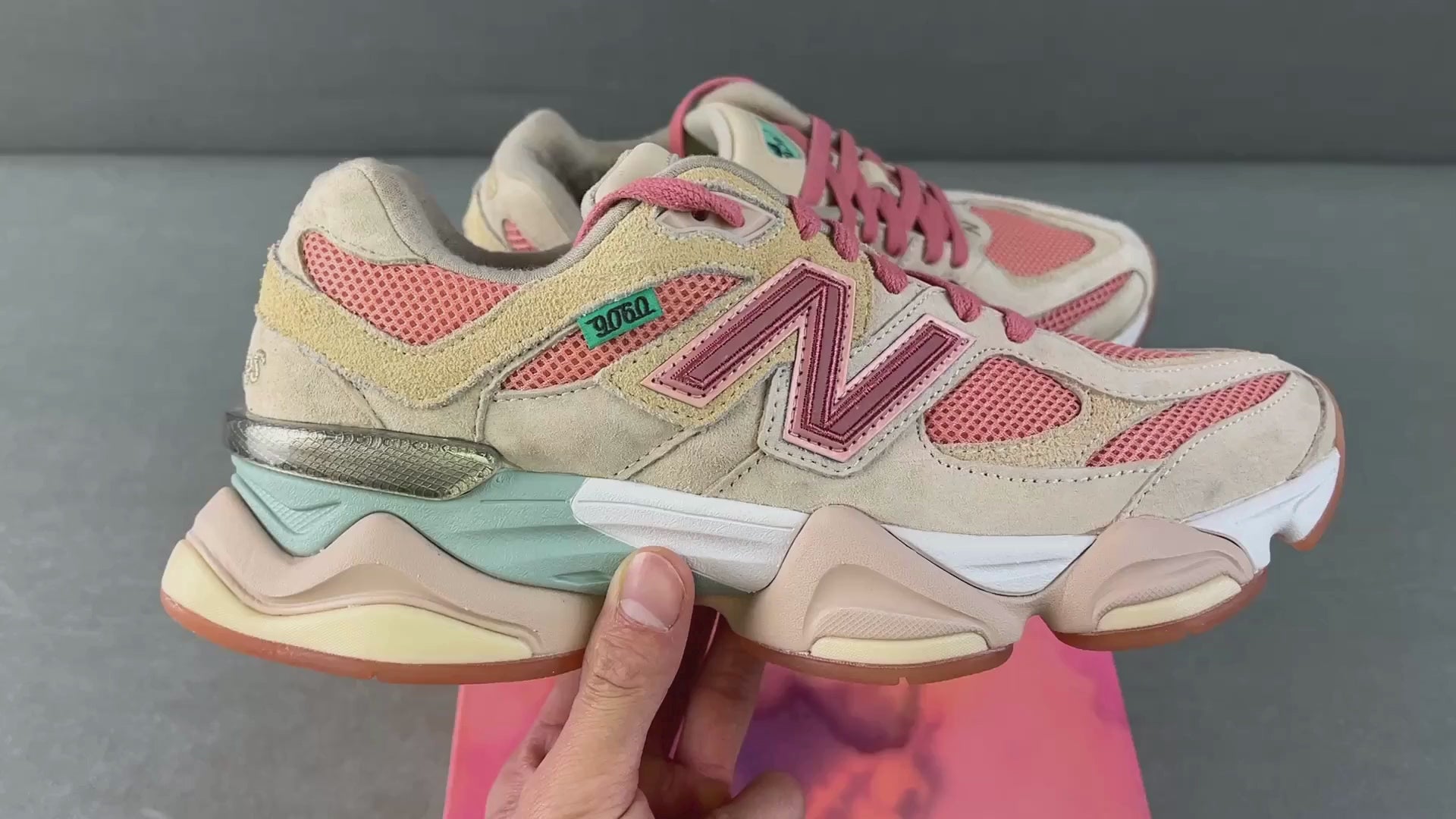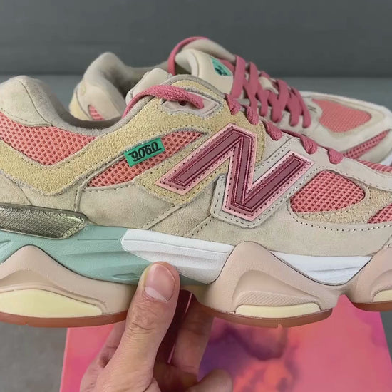 O Joe Freshgoods x New Balance 9060 'Penny Cookie Pink' é retirado do pacote 'Inside Voices', a continuação do designer de Chicago para sua colaboração 'Outside Clothes' de 2021. Esta joint venture apresenta uma nova silhueta que mistura influências da icônica série 990 com tênis de corrida clássico do início dos anos 2000. A parte superior combina sobreposições de camurça cor de pêssego em malha rosa respirável e um forro têxtil acolchoado. Os elementos de marca incluem um logotipo 'N' rosa e 'Inside Voices' bordados no calcanhar traseiro do sapato esquerdo e direito. O amortecimento leve chega por meio de uma entressola ABZORB dividida, apoiada sob os pés por uma sola podular em borracha de goma.